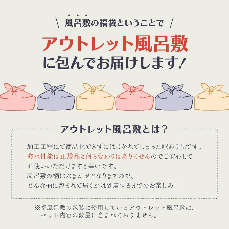 | 特徴 | ・風呂敷以外の日常で使える便利なアイテムも入っています。 ・3種類の中から欲しいセットをお選びいただけます。 ・アウトレット風呂敷に包んでお届けします。 |