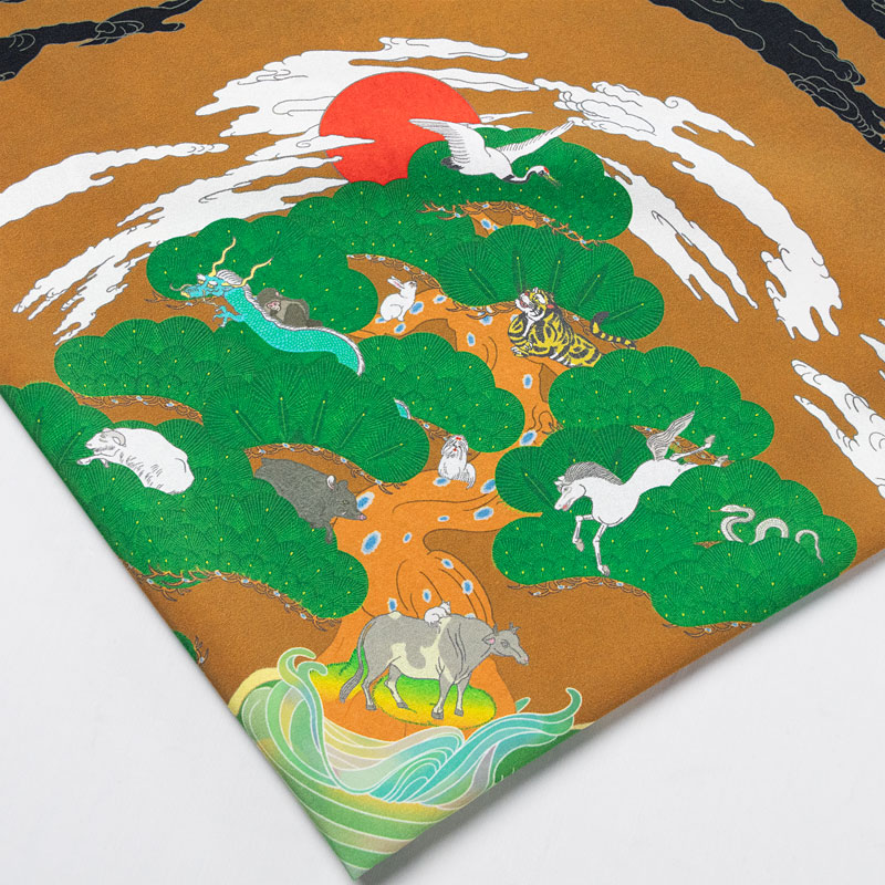 能舞台の鏡板をモチーフにした古典的な松と、水鏡に映る幻想的な松をメインに、十二支や虎柄のような雲など、縁起が良いモチーフを寄せ集めました。 水鏡の中では、十二支が「寿」と呼ばれる獣に合体したり、仲間に入れなかった猫が泳いでいたりと物語が広がるデザインです。