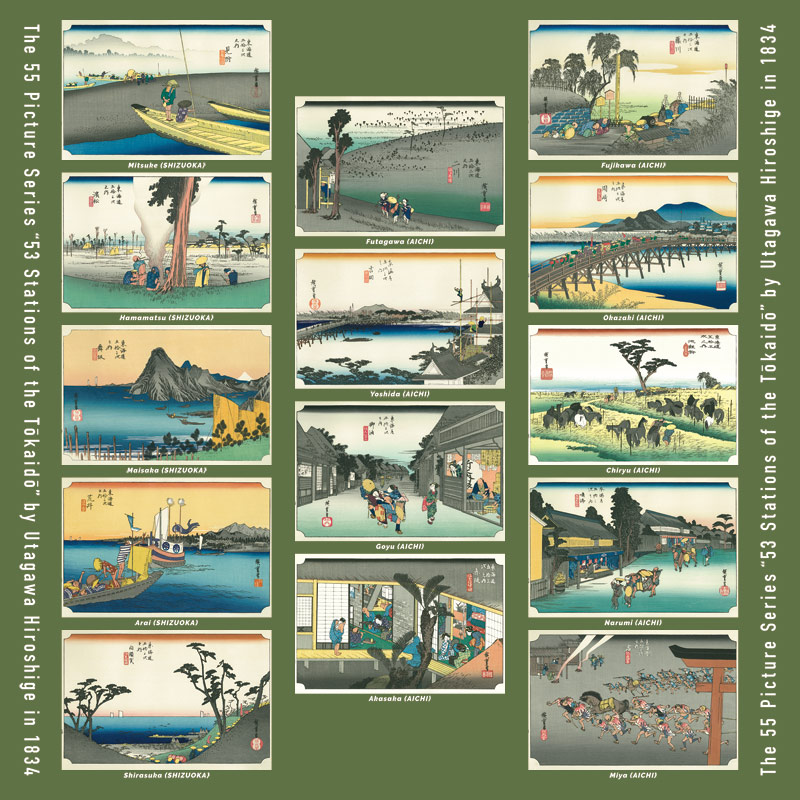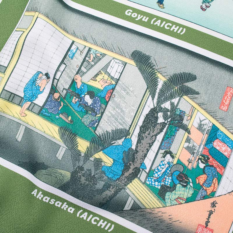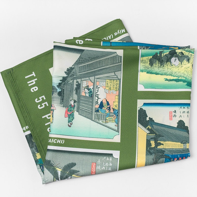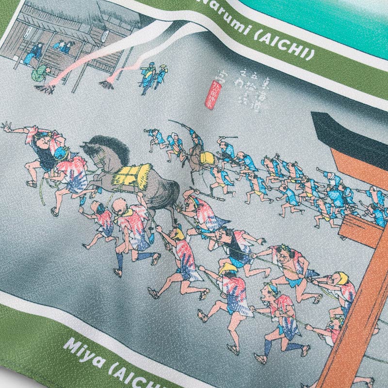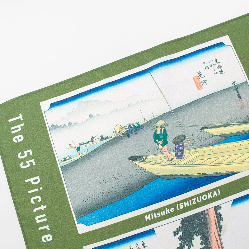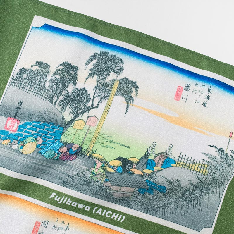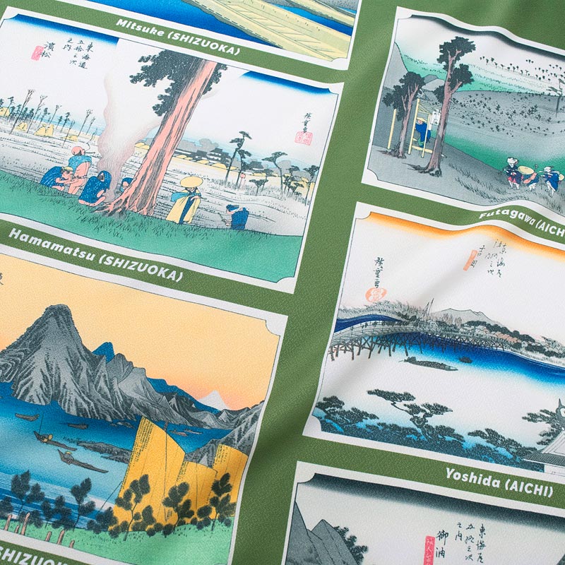 ~アムンゼンは凹凸感があって、サラッとした肌触りです~歌川広重(1797-1858)の代表作『東海道五十三次』で大判の風呂敷4枚セットを作りました。本品には見附宿、濱松宿、舞坂宿、荒井宿、白須賀宿、二川宿、吉田宿、御油宿、赤阪宿、藤川宿、岡崎宿、池鯉鮒宿、鳴海宿、宮宿がプリントされています。